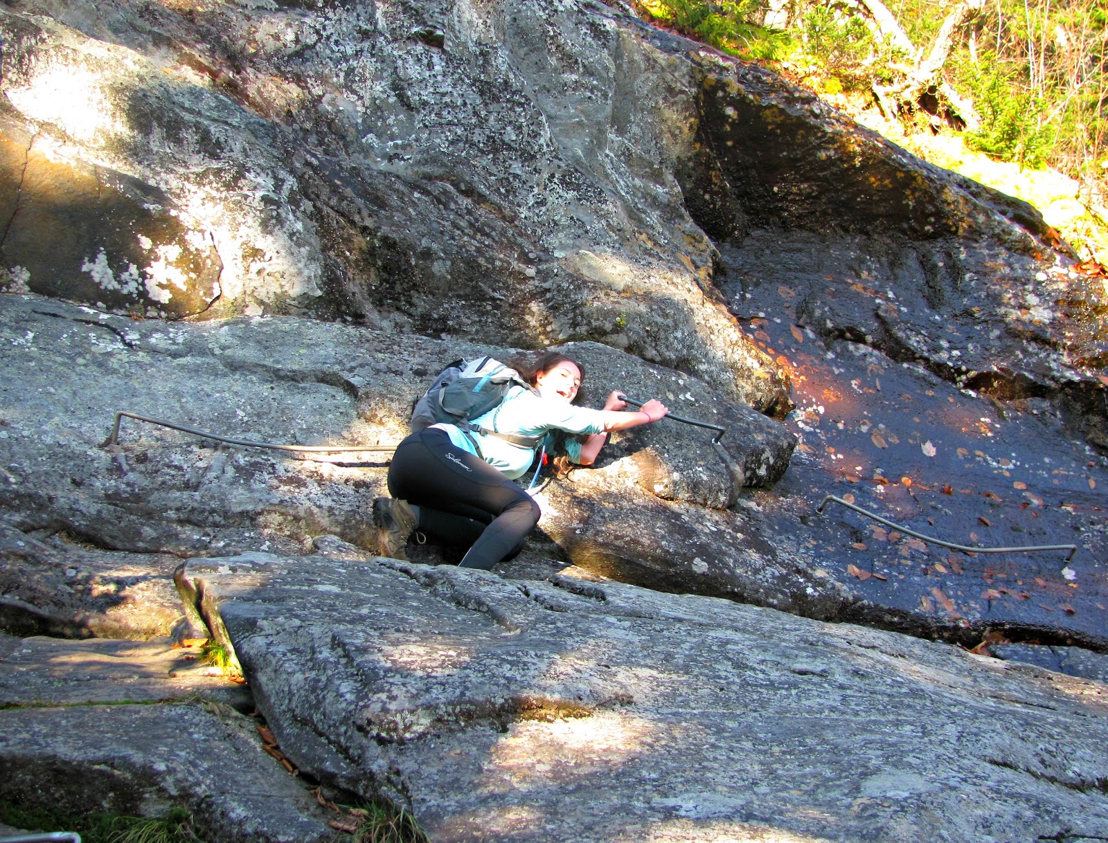 There are a few metal handholds that stick out of the rocks and you have to step on those and shuffle your way over to a metal ladder. I wouldn’t want to do this in winter!